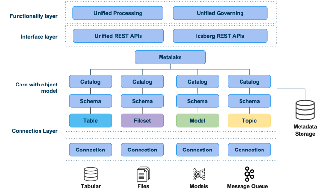 - 核心对象模型:Gravitino 定义了一个通用元数据模型,用于表示不同来源和类型的元数据,并以统一的方式管理它们。