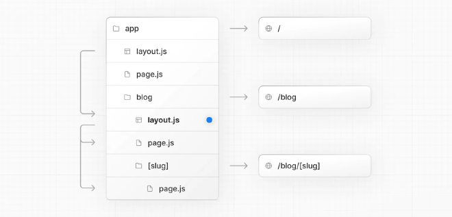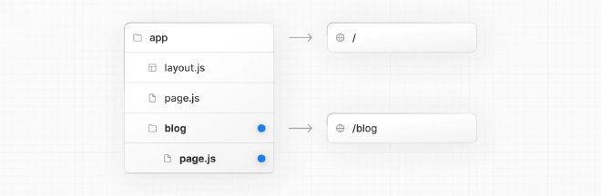 创建嵌套路由,您可以在每个文件夹内部嵌套其他文件夹。例如,要添加对 /blog 的路由,在 app 目录中创建一个名为 blog 的文件夹。然后,为了使 /blog 公开可访问,添加一个 page 文件: